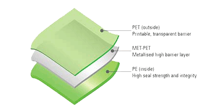 Metalized PET: are polymer films coated with a thin layer of metal, usually aluminium. They offer the glossy metallic appearance of an aluminium foil at a reduced weight and cost.