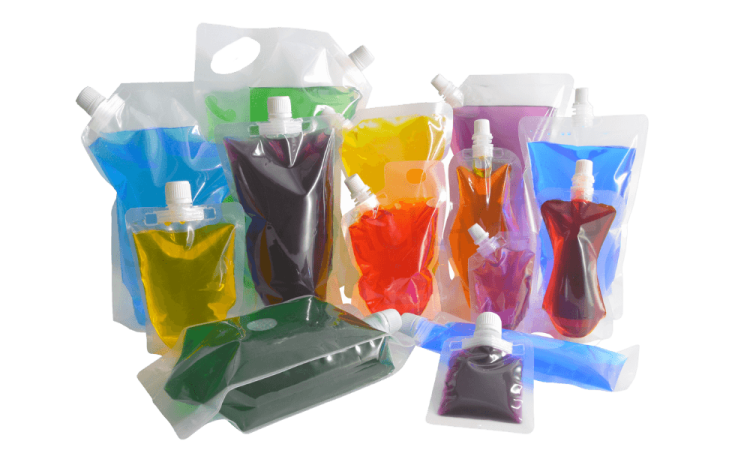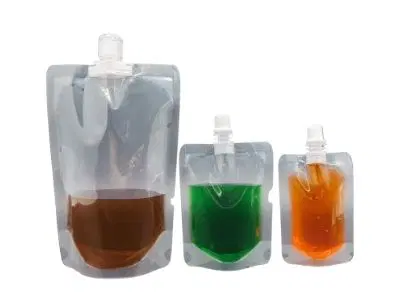 Transparent spouted liquid packaging bags in different sizes, containing brown, green and orange liquids respectively.