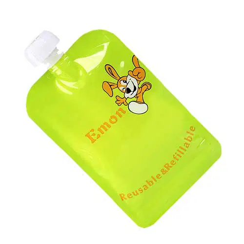 A spout pouch is a plastic bag made of BPA-free material. A spout pouch is often used for food storage, drink pouches, and to package liquid drinks like juice or milk.